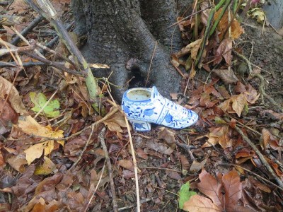 Now we come to a condensed area of trees, ferns and downed limbs. This is where deep play comes alive and the children imagine they are many different things from squirrels tucked in their homes for winter to deep sea divers touring the depths of the ocean. This area provides uneven terrain where the children can develop their sense of balance, stimulating their vestibular system and their sense of proprioception (awareness of where their physical body and it’s parts are in space). As we return each week the children find their bodies more and more able to manage the varying landscape. Many treasures are found in Baltimore Woods from earthworms and rolly pollies to this china shoe. We hide this shoe in a different spot at each visit and upon returning are challenged to remember where we left the shoe. As the seasons change, the landscape changes also and the children find searching for the hidden shoe a hunt worthy of our their energy.