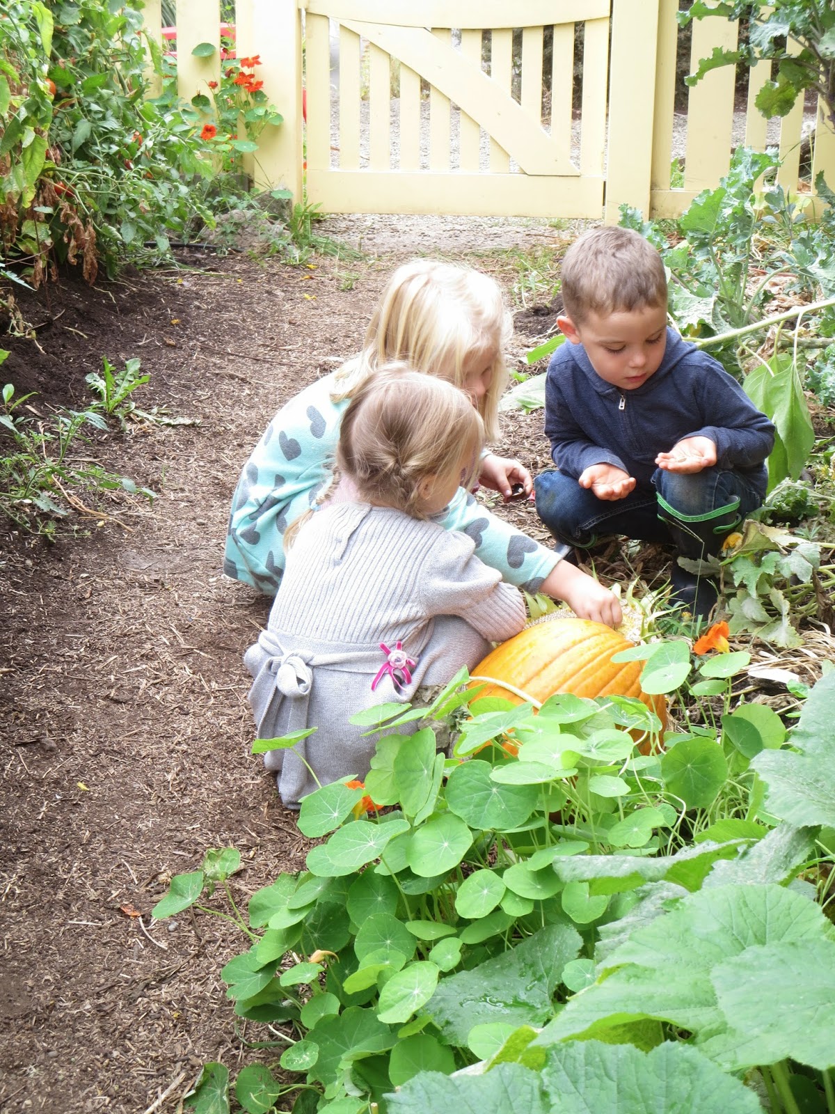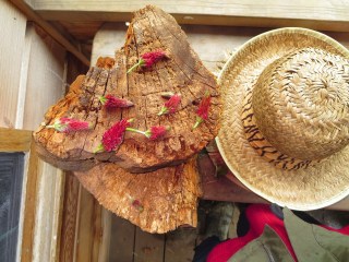The playgarden is an inspiring place to play with growing plants, dirt to work, worms to care for and chickens to feed. The children learn to harvest, plant, weed and care for the garden as they individually are awakened to what the garden has to offer. We eat from our garden and surplus is shared with the families. We watch the cycle of the seasons through our plantings. Below you can see clover heads being used to decorate a cake in the mud pie kitchen. Plants like clovers are excellent for taking the children through the cycle of the season. We plant the clover seed in early fall and watch as the clover sprouts. In winter we see the clover hold the garden together and now in spring we see the clover shoot forth their bright red heads to be enjoyed by the many bees that visit our playgarden.