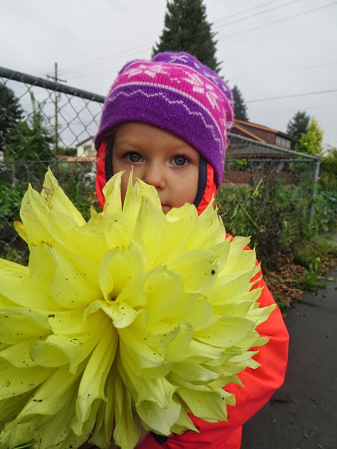 As we return to the school we are greeted by neighbors who are becoming more and more familiar to us. Neighbor Uncle Dan is often in his garden and is delighted to see the children. He presented us with this dinner plate Dahlia and one of our smallest LittleRoot Children took great pride in carrying it back to our school. While we walk through the neighborhood to the woods and back we sing Ella Jenkins’ song “A Neighborhood is a Friendly Place”. We are sure learning the truth of that song thanks to neighbors like Uncle Dan.