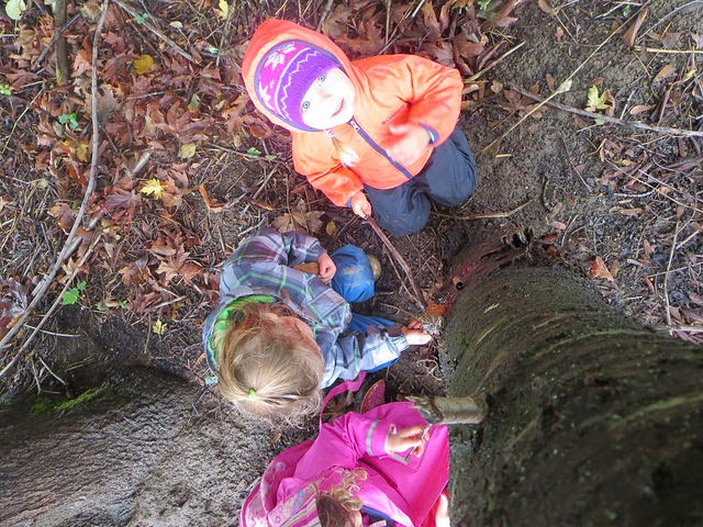 The children run for this spot first and once they have arrived, they exclaim, “We made it!” as if they have overcome a great trial. They call this the sap tree as there is a hard ball of sap coming from the tree where a limb has broken off. It is a delight to see the sap grow and change through the seasons. The children attempt to remove sap at every visit regardless of previous failed attempts. Different “tools” are found in the woods to work at this project.
