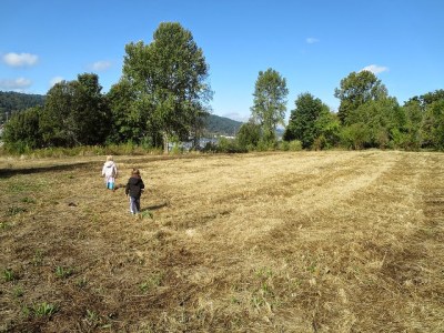 Next our journey takes us along a path that is lined with tall Broad Leaf Maples on one side and native grasses along the other. To the children this span feels like a long hike into deep woods although it is about the length of a city block. This long open path allows some autonomy as I can see the children even if they have run ahead or are taking their time enjoying a slow journey. We all meet up where there is a small hill the children climb to and each proclaim “I am King of the mountain”.